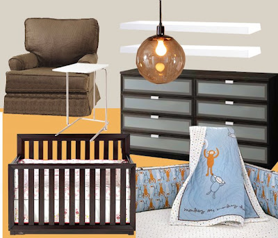 i think...i like the two tone blue, but maybe add orange btwn the two or accent w/ orange decals/pics...what an original color scheme either way! i LOVE the monkey businees stuff. so perfect! and i'm all for planning ahead...damn...if you're "nesting" now what will you do w/ yourself in 3 months? ;)
